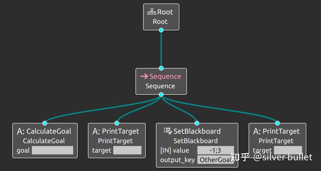 行为树主要有4种节点,其中的ControlNode和DecoratorNode常由库实现,而ConditionNode和ActionNode需开发者自行实现,即定义何种情况执行何种行为。