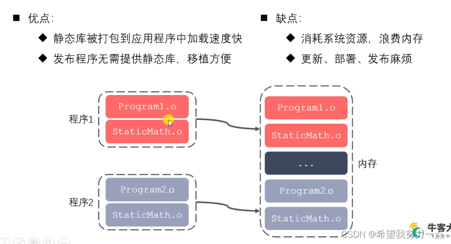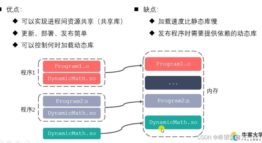 动态库:链接时,动态库代码不会被打包到可执行程序里,只会打包名字等库信息。启动时,动态库会被动态加载到内存中, 通过