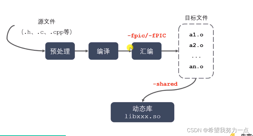 gcc -c -fpic/-fPIC test.cpp生成.o目标文件 (是一个和位置无关的代码)-fpic( pic:position independent code位置无关码)用于编译阶段,产生的代码没有绝对地址,全部用相对地址,满足了共享库的要求,共享库被加载时地址不是固定的。- 如果不加
