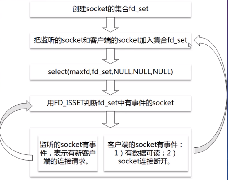 // 调用select函数时,会改变socket集合的内容,所以要把socket集合保存下来,传一个临时的给select。