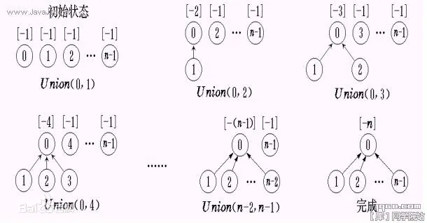 调用union方法时,首先用is_same_set方法判定是否是同一个集合,如果不是,则两个元素向上走,找到各自集合的代表元素,之后比较两个集合元素个数的多少,少的那个集合的集合代表元素的指针指向多的那个集合的集合代表元素,这样就完成了union