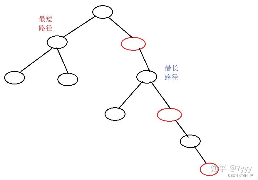 - 如果我从一个节点出发,往下走,怎么样最长,那一定是:红->黑->红->黑...交替