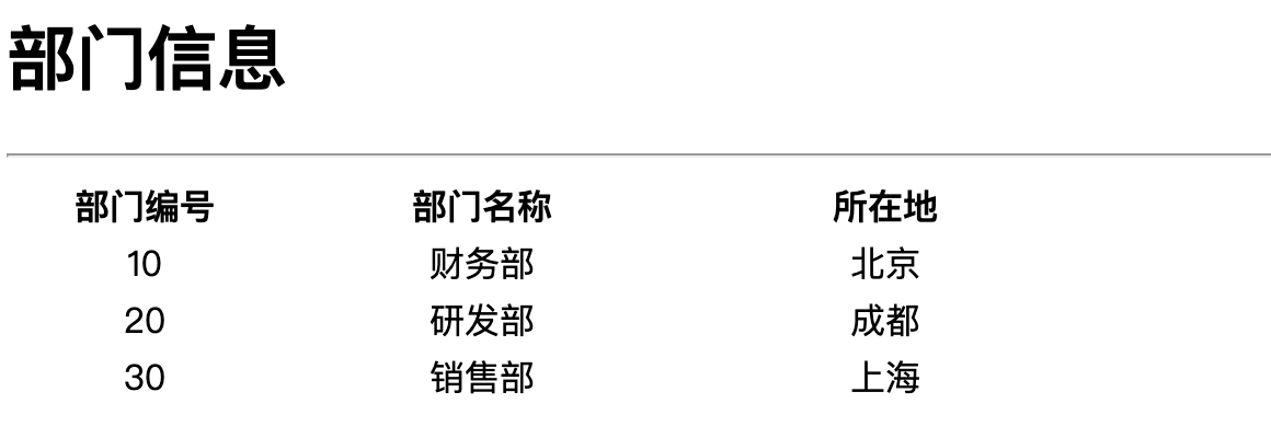(venv)$ touch templates/index.html (venv)$ vim templates/index.html<!DOCTYPE html> <html lang="en"> <head> <meta charset="UTF-8"> <title>首页</title> </head> <body> <h1>部门信息</h1> <hr> <table> <tr> <th>部门编号</th> <th>部门名称</th> <th>所在地</th> </tr> { % for dept in depts_list % } <tr> <td>{ { dept.no } }</td> <td>{ { dept.name } }</td> <td>{ { dept.location } }</td> <tr> { % endfor % } </table> </body> </html>在上面的模板页中我们使用了