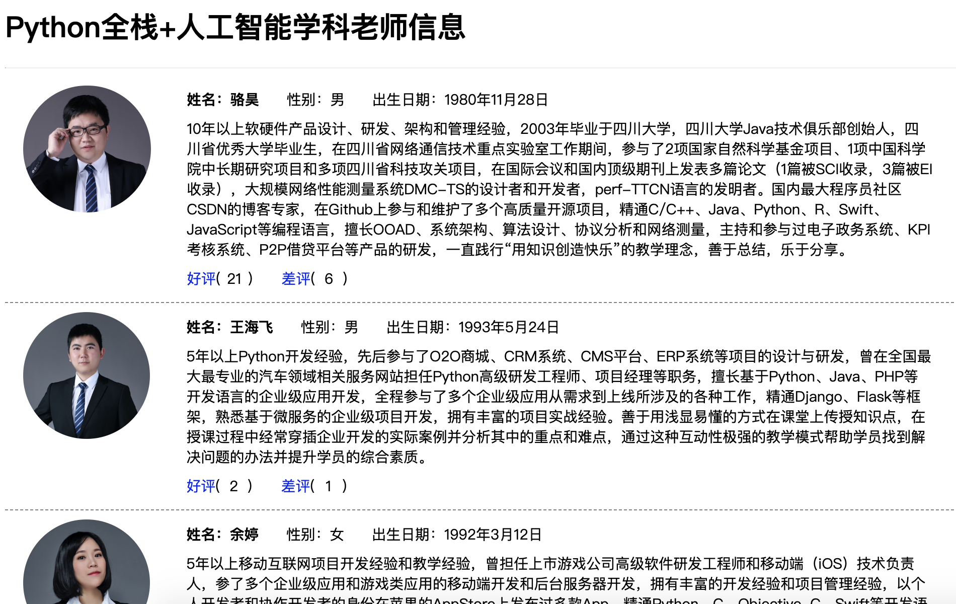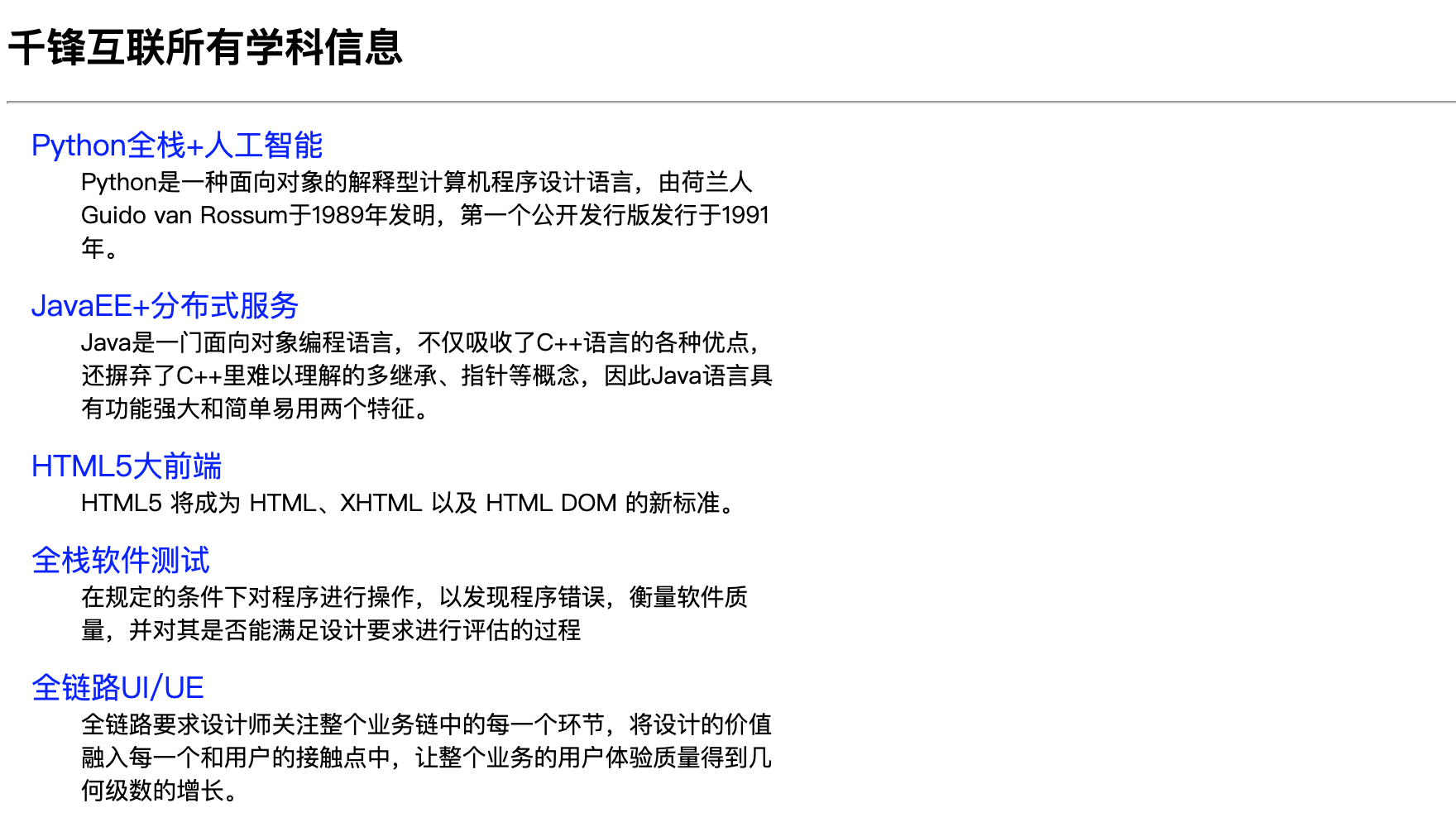 在上面的模板中,我们为每个学科添加了一个超链接,点击超链接可以查看该学科的讲师信息,为此需要再编写一个视图函数来处理查看指定学科老师信息。