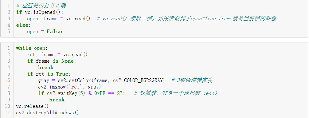 cv2.VideoCapture可以捕获摄像头,用数字来控制不同的设备,例如0,1。vc = cv2.VideoCapture("../img/test.mp4")如果是视频文件,直接指定好路径即可。
