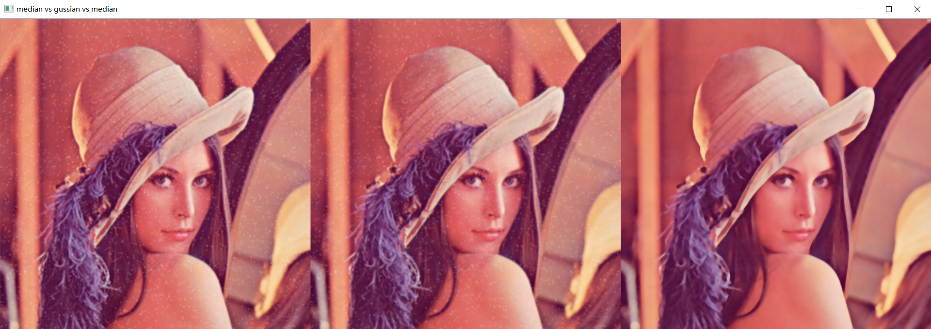 res = np.hstack((blur1,gussian,median)) # 水平拼接 cv2.imshow('median vs gussian vs median', res) cv2.waitKey(0) cv2.destroyAllWindows()