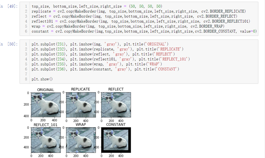 BORDER_REPLICATE:复制法,也就是复制最边缘像素。BORDER_REFLECT:反射法,对感兴趣的图像中的像素在两边进行复制,例如:fedcba|abcdefgh|hgfedcbBORDER_REFLECT_101:反射法,也就是以最边缘像素为轴,对称gfedcb|abcdefgh|gfedcbaBORDER_WRAP:外包装法,cdefgh|abcdefgh|abcdefgBORDER_CONSTANT:常量法,常数值填充。