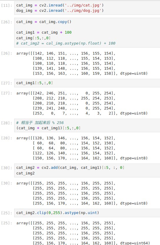 260变为uint8型的话,因为260-256,所以会让B的值为4。经常会由于这个原因让像素的值变得不正确。所以上面的第四步的操作(限定值的范围在[0,255]之间)是必要的。