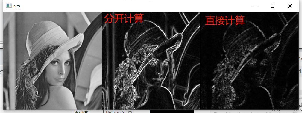 lena = cv2.imread("../img/lena.jpg", cv2.IMREAD_GRAYSCALE) # 分开计算 sobelx = cv2.Sobel(lena, cv2.CV_64F, 1, 0, ksize=3) # dx=1,dy=0,只计算水平方向 sobelx = cv2.convertScaleAbs(sobelx) # 不能丢弃负值,需要去绝对值 sobely = cv2.Sobel(lena, cv2.CV_64F, 0, 1, ksize=3) # dx=0,dy=1,只计算垂直方向 sobely = cv2.convertScaleAbs(sobely) sobelxy1 = cv2.addWeighted(sobelx, 0.5, sobely, 0.5, 0) # 直接计算 sobelxy2 = cv2.Sobel(lena, cv2.CV_64F, 1, 1, ksize=3) # dx=1,dy=1,直接计算(不建议,效果不好,建议分开计算再) sobelxy2 = cv2.convertScaleAbs(sobelxy2) show_img([lena, sobelxy1, sobelxy2], hstack=True)
