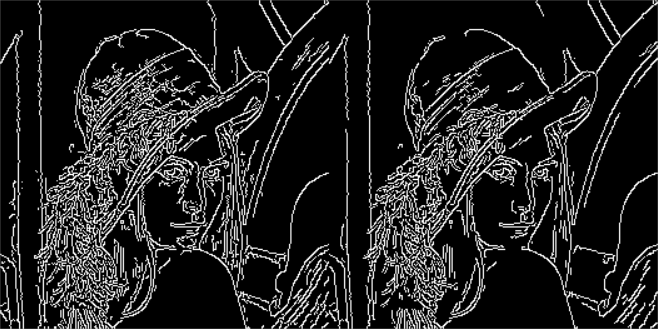 img=cv2.imread("lena.jpg",cv2.IMREAD_GRAYSCALE) v1=cv2.Canny(img,80,150) v2=cv2.Canny(img,50,100) # 80和150:minVal和maxVal res = np.hstack((v1,v2)) cv_show(res,'res')