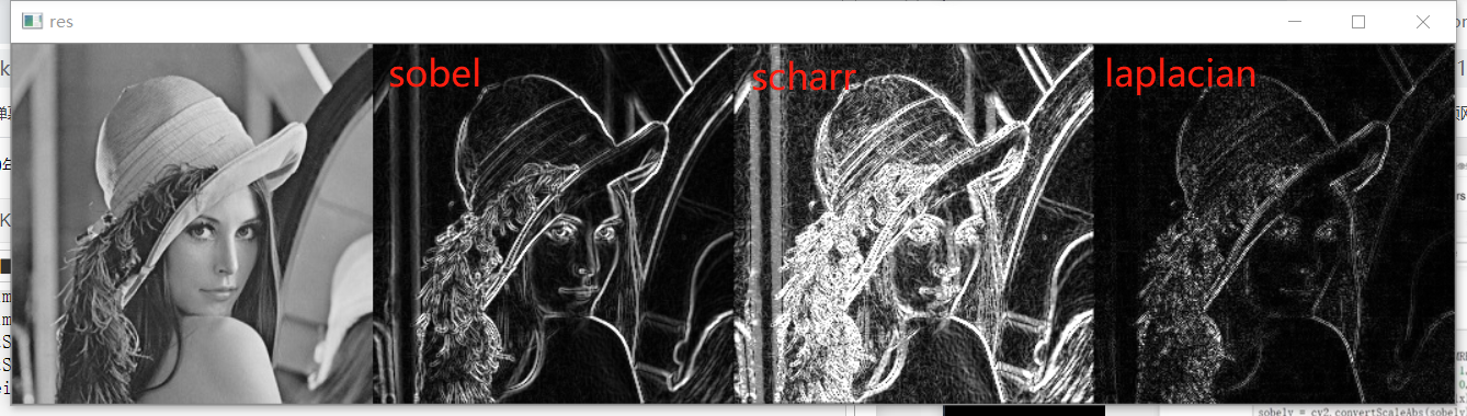 scharrx = cv2.Scharr(lena, cv2.CV_64F, 1, 0) scharry = cv2.Scharr(lena, cv2.CV_64F, 0, 1) scharrx = cv2.convertScaleAbs(scharrx) scharry = cv2.convertScaleAbs(scharry) scharrxy = cv2.addWeighted(scharrx, 0.5, scharry, 0.5, 0)