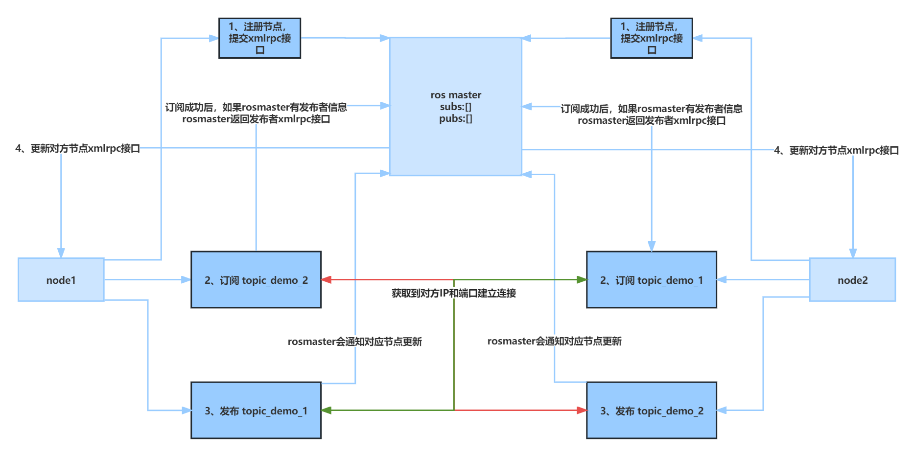 订阅 topic_demo_2流程一样,最后rosmaster会返回发布该topic的所有XmlRpc链接列表,最后更新updates属性 topic_demo_node_2节点初始化流程中,RegManager().start():开线程向ros_master注册节点,最后执行了死循环run()topic, uris = self.updates.pop():从updates取出topic和XmlRpc链接get_topic_manager().check_all():移除异常断连的连接self._connect_topic_thread(topic, uri):遍历urls启连接topic线程,每个topic启一个线程ROSHandler()._connect_topic(topic, uri)xmlrpcapi(pub_uri, cache=False).requestTopic():请求发布节点的接口- 以下为发布节点内的操作