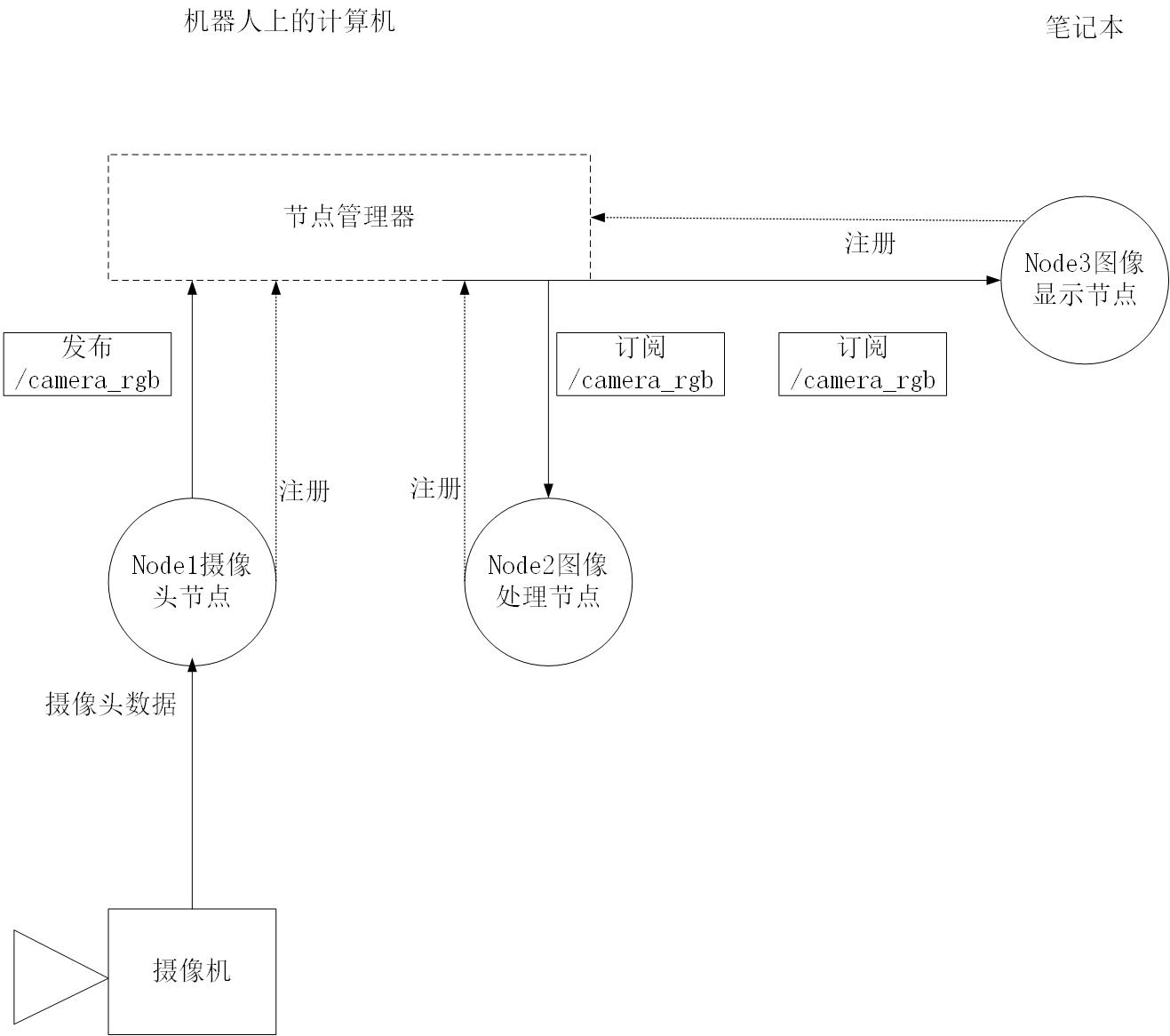 ROS是一种分布式的架构,一个topic可以被多个节点同时发布,也可以同时被多个节点接收。比如在这个场景中用户可以再加入一个图像显示的节点,我们在想看看摄像头节点的画面,则可以用自己的笔记本连接到机器人上的节点管理器,然后在自己的电脑上启动图像显示节点。