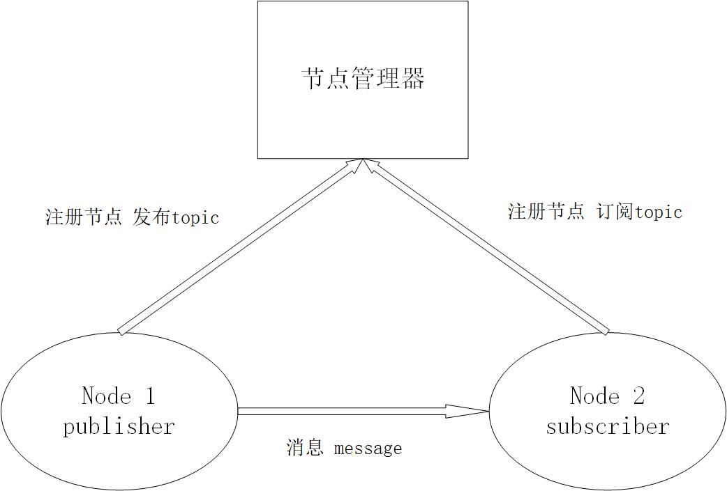 参考下图,我们以摄像头画面的发布、处理、显示为例讲讲topic通信的流程。在机器人上的摄像头拍摄程序是一个node(圆圈表示,我们记作node1),当node1运行启动之后,它作为一个Publisher就开始发布topic。比如它发布了一个topic(方框表示),叫做/camera_rgb,是rgb颜色信息,即采集到的彩色图像。同时,node2假如是图像处理程序,它订阅了/camera_rgb这个topic,经过节点管理器的介绍,它就能建立和摄像头节点(node1)的连接。