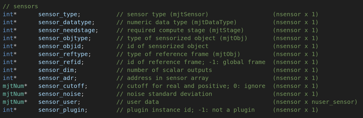 sensordata的索引需要依靠mjData的sensor_adr获取,这个可以使用sensor的id 这个我们要注意传感器具有的数据量,有的传感器是一个值,而有的传感器是三个值。我们可以使用mjModel中的sensor_dim获得传感器输出的参数量